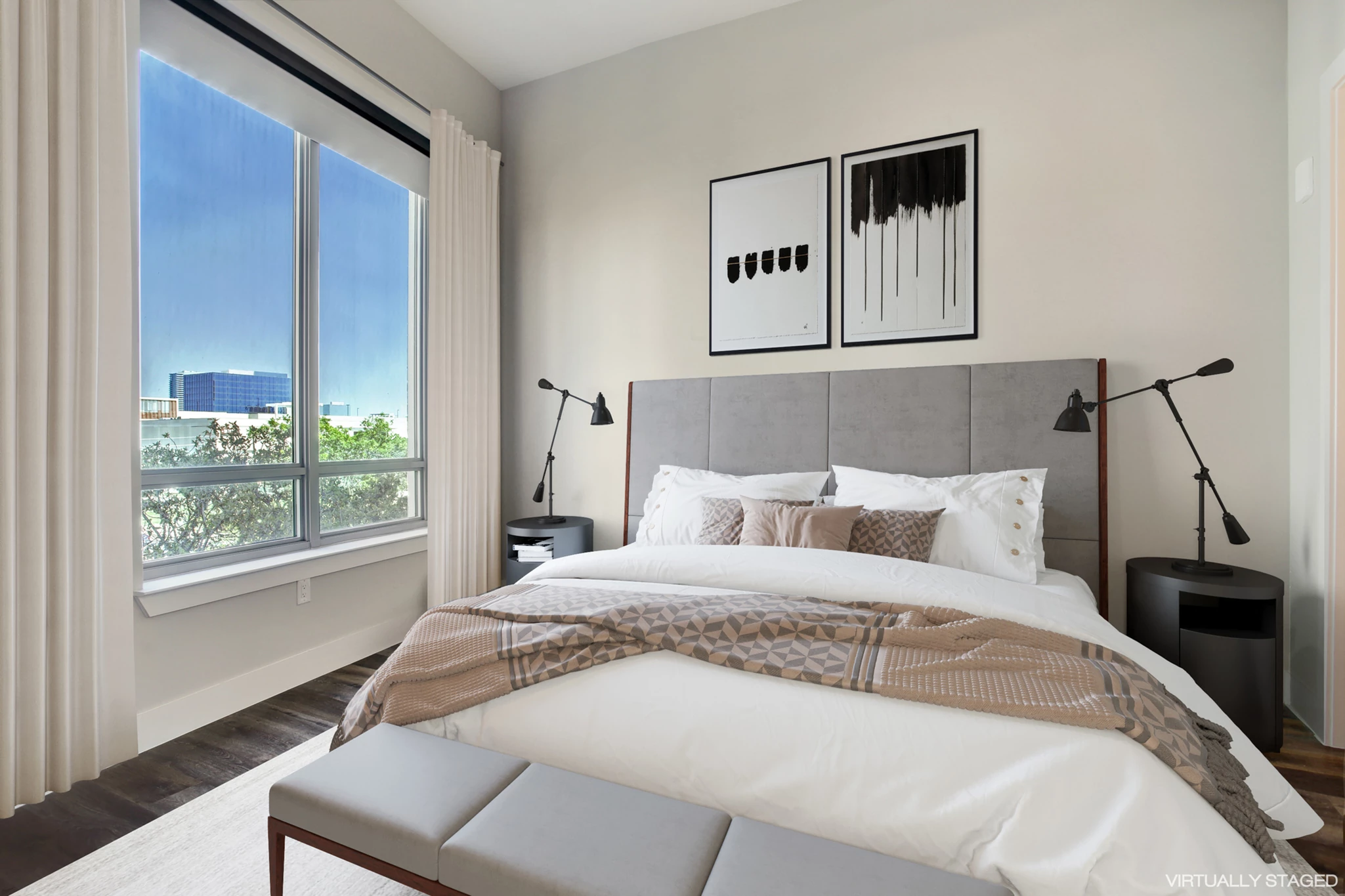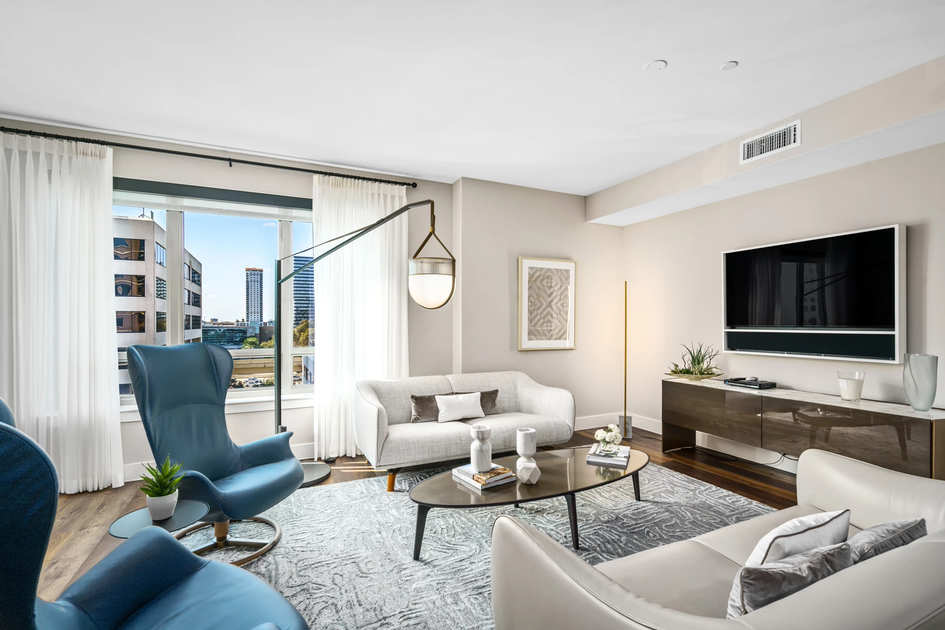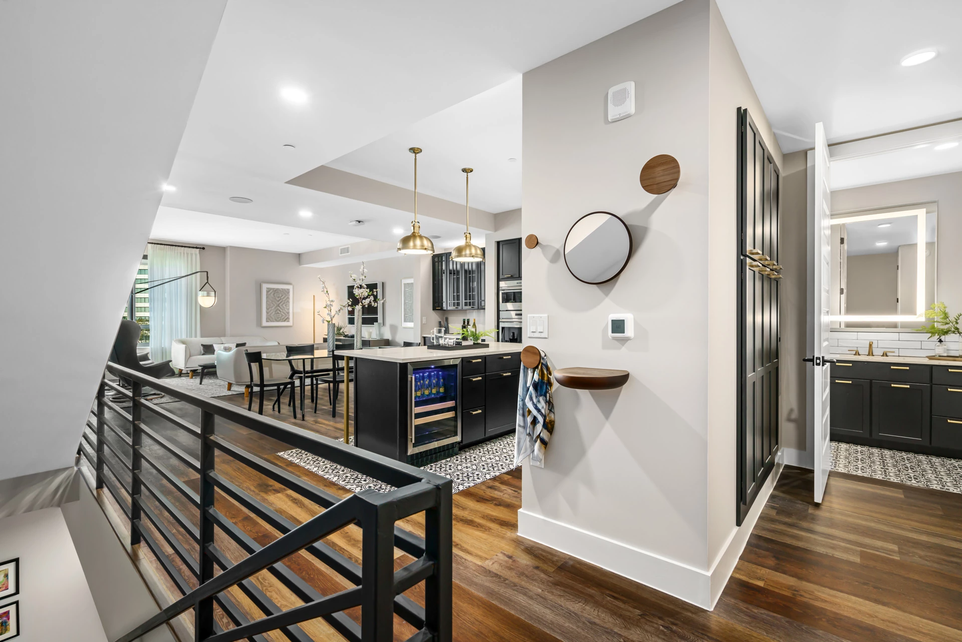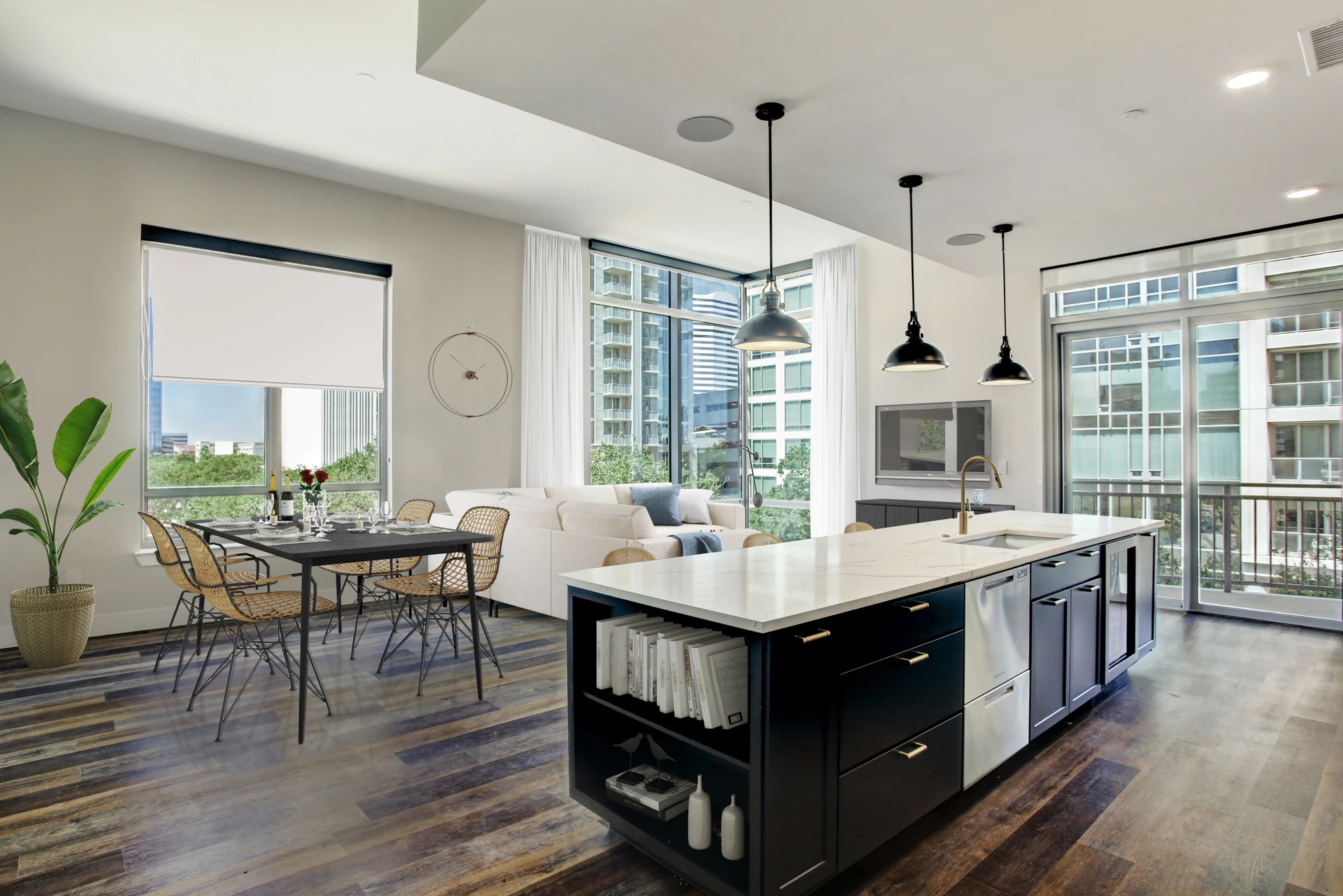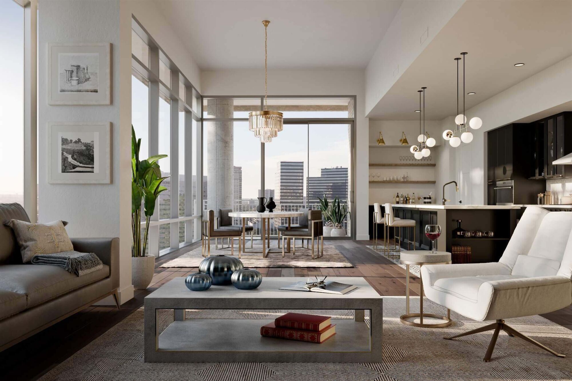 The Penthouses are exemplary of Crimson quality. These generously sized homes are enhanced with extended ceiling heights of 14’, an upgraded appliance package featuring Wolf and Fisher & Paykel, expanded smart home lighting controls, and scenic Galleria or Downtown skyline views.